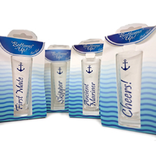 Стопки в подарочной упаковке с надписями в морском стиле: First Mate, Skipper, Ancient Mariner, Cheers.
